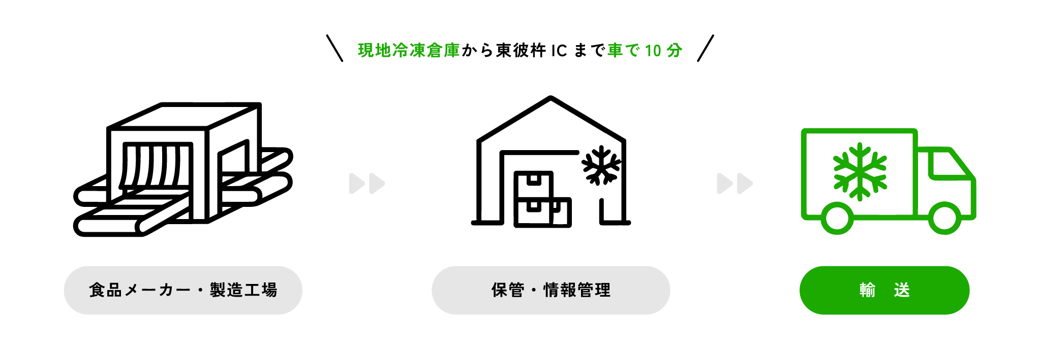 保管効率が良い移動ラックを採用。急速冷凍庫を完備しており、日に20tの凍結能力を有しています。在庫ロケーションシステム導入、在庫状況がリアルタイムで把握でき、ピンポイントで商品の特定が可能。移動ラックとも連動し、スピーディな入出庫を実現。